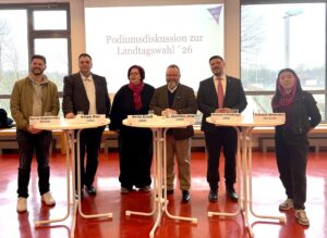 In der Aula des Brettener Hallenzentrums trafen am 10. Februar Schülerinnen und Schüler des Beruflichen Gymnasiums auf Kandidatinnen und Kandidaten zur Landtagswahl 2026. Organisiert wurde die Podiumsdiskussion von der Fachschaft GGK. In einer respektvollen und engagierten Atmosphäre wurden landes-, bundes- und kommunalpolitische Themen kontrovers diskutiert. Zu Beginn begrüßte Andrea Neumann, Abteilungsleiterin des Beruflichen Gymnasiums, die Anwesenden. Sie dankte ausdrücklich den GGK-Lehrkräften Fabian Spachholz-Verch, Holger Ritzhaupt und Benjamin Winterstein für die Vorbereitung der Veranstaltung. Ohne deren Engagement, so Neumann, „wäre dieser heutige Austausch nicht möglich“.